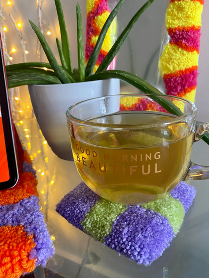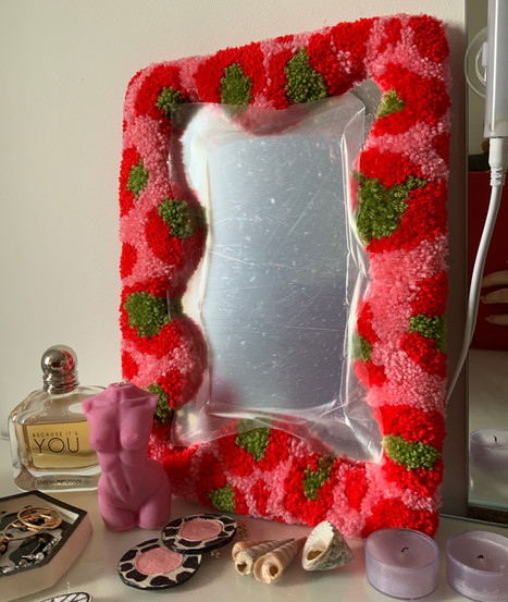 This week with my rugging, I got an order for pastel purple and green custom coasters. Custom orders are fab because that colour combination I wouldn’t have thought of doing, but they work super well together. I completed a custom mirror rug which was pink, orange and yellow. I also did a custom mirror rug, which was a red, pink and green leopard print, which I think resembled strawberries. This week I want to take some more product photos, but in my bedroom, using a rug on my bed side cabinet.