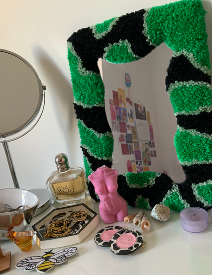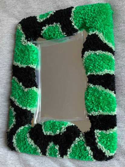 I've been really fortunate this week as I've had three orders for my rugs! Firstly, someone asked for a custom rug on Depop made from green and black yarn in a cow print pattern. I did her a sketch which she was super happy with. I was really happy with how it turned out. Previous times I've made mirror rugs I've accidentally scratched the mirror, so I left some film on this one while making it. I photographed it and listed it on Etsy and Depop. I sent it off and the customer was super happy when it arrived. My second purchase was from Depop, and they were a pair of cow print coasters. These are super quick to make, so I made and sent them in a couple days. My last order this week was a zebra print mirror from Etsy. I've started making this, but I've had to wait for mirrors and yarn that I've ordered to arrive, so I'll hopefully finish this in the next few days.
