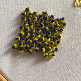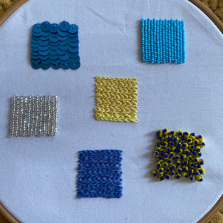 The last couple weeks I've been doing samples for Saveliin. These are super time consuming, but I'm really enjoying doing them and it's good to get the practice. I started off doing the blue sequins, the I did some beading with the silver beads. I showed these to Saveliin, and she suggested sewing them closer together, which I corrected when sewing the blue beads. I then used the chain stitch using blue and yellow thread. The most recent one I've done is the yellow beads with blue thread and beads, to symbolize flowers. I need to do that sample again but using pink beads next time, and then go from there.