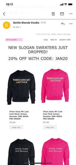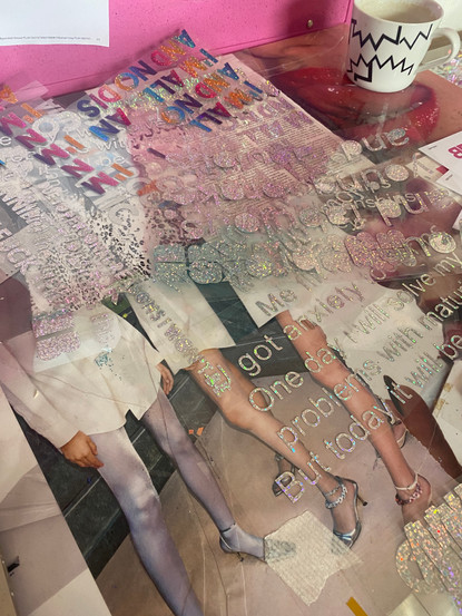 This week at Bottle Blonde we started off by catching up on t-shirt orders. As I've done this a few times now I can happily say I can do the whole process independently. We got through so many! We were all asked to make a few mug designs, and then have a design meeting to showcase every ones work. As I've done so many this was difficult for me to think of some new ones, but I enjoyed doing it as it was great to see everyone else's. For the rest of the week I went to the studio, and taped tinsel ready to be made into the jackets. Also shown in the photos is an email, where my photo-shopped sweaters are featured.