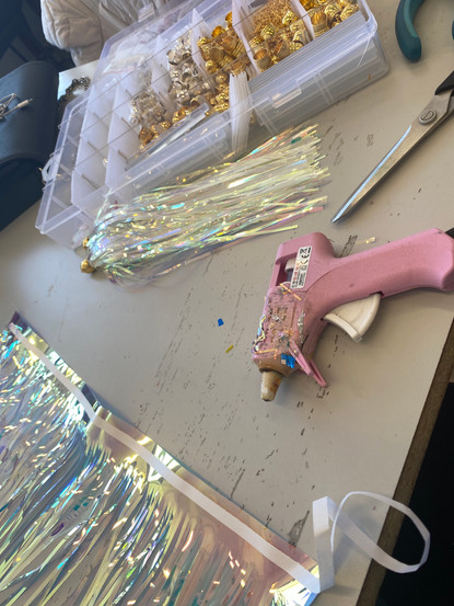 This week I learnt a new skill, which was making tinsel earrings! This involves rolling up the tinsel, and hot gluing it into the earring top. Then you have to use pliers to attach the hook, and trim the earrings to the right length. I actually loved doing these! I also taped some tinsel this week, as our carnival tinsel finally arrived! I had to Photoshop some images to go online, as they ran out of pink paint before finishing the board, so I had to colour in the pink myself. Lastly, we rearranged the studio, as all the t-shirt printing equipment is being moved to the studio, so everything can be done there rather than at Chloe’s house.